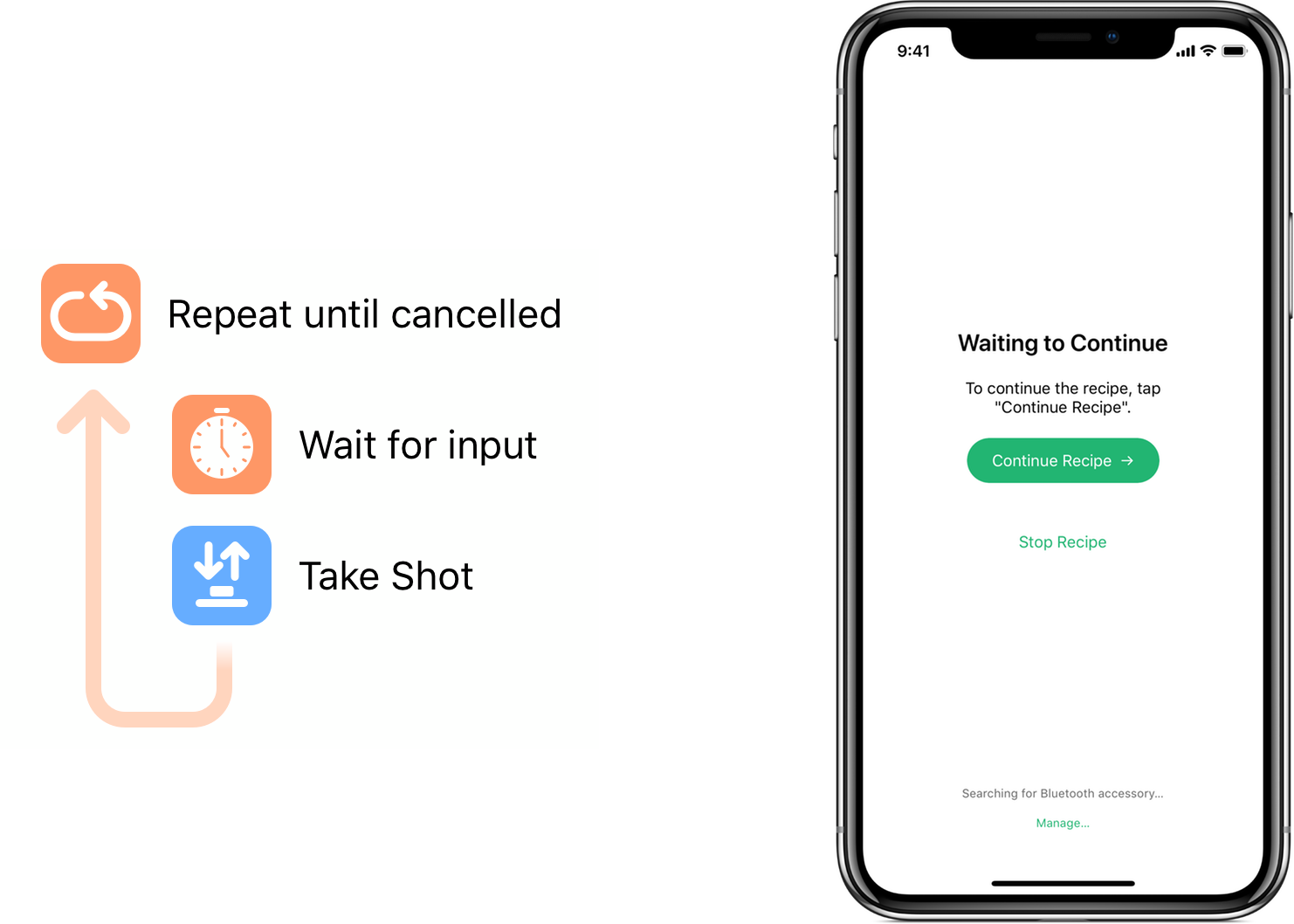 To connect to a Bluetooth accessory, when the Waiting to Continue screen is displayed while you’re running your recipe, tap the Manage… button at the bottom of the screen. Cascable will search for available accessories and attempt to connect to them. Once connected, you can use your Bluetooth accessory to provide remote input.